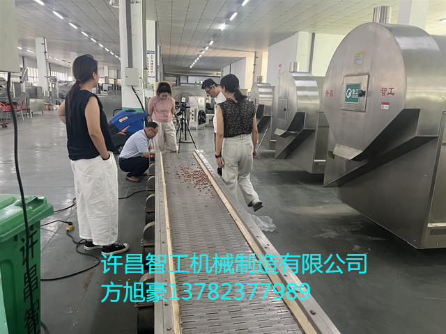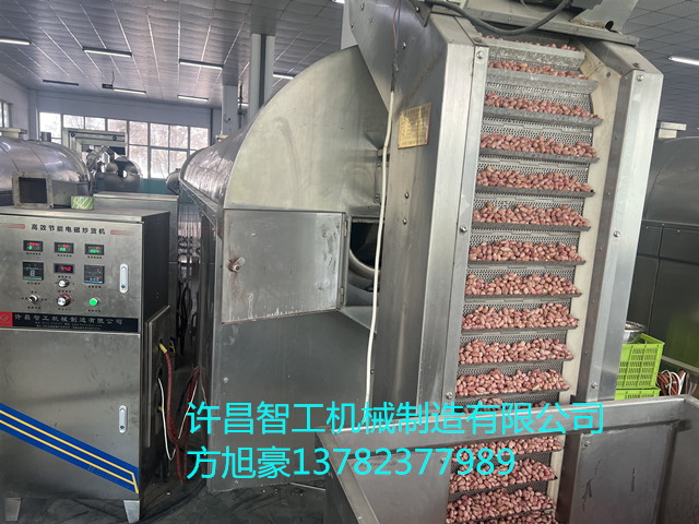 许昌智工八米电磁流水线包含上料炒制筛选冷却流水线操作,时产五香花生米1200斤,炒出来的花生米色泽漂亮,不脱皮,不变色,口感均匀